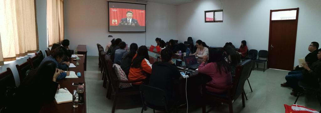全体师生认真听取了习近平总书记代表第十八届中央委员会向大会所做的报告。报告围绕新时代坚持和发展什么样的中国特色社会主义,怎样坚持和发展中国特色社会主义这个重大时代课题,深刻阐述了新时代中国特色社会主义思想的科学体系、精神实质和丰富内涵,准确把握中国特色社会主义发展新时代的历史方位、基本方略和主要矛盾的转化等重大问题,牢牢把握和立足社会主义初级阶段的基本国情和实际来谋篇布局,绘就了新时代中国特色社会主义的宏伟蓝图,吹响了新时代中国特色社会主义的进军号。跟随习近平总书记的讲话,大家认真观看,深切感悟,并认真做记录,了解了过去五年我国在各个方面的发展状况,以及未来祖国的发展蓝图,接受了一次精神上的洗礼。