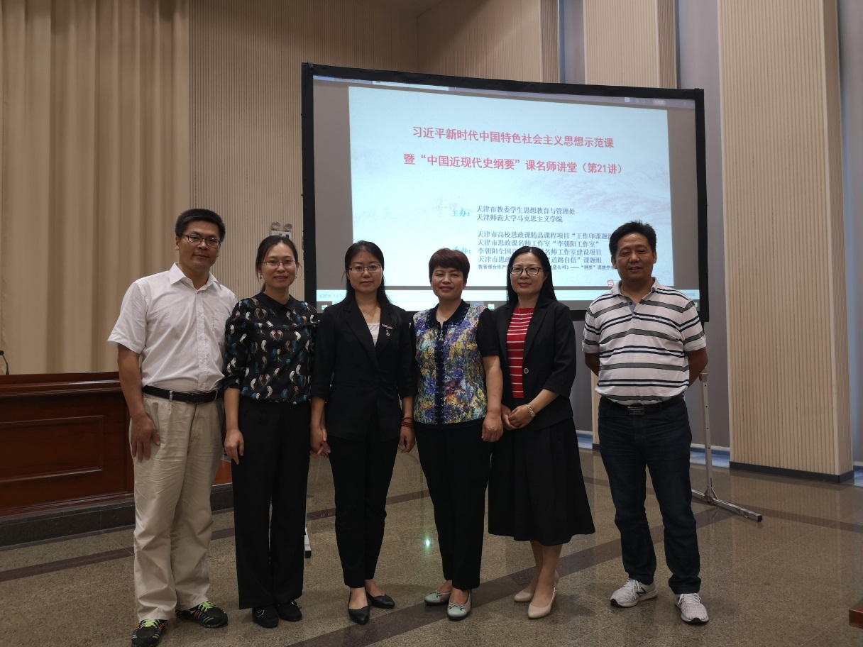 本次活动,应邀展示的均为在全国或天津市教学比赛中获奖的优秀教师。来自绵阳师范学院的韩晓娟主讲“戊戌变法失败的原因和历史启示”,天津外国语大学的郑海呐主讲“中国特色社会主义文化”,天津师范大学的于江涛主讲“科学评价历史伟人毛泽东”,天津职业大学的陈浩男主讲“培育和践行新时代文化自信”,天津城建大学的屈彩霞主讲“新民主主义革命道路与井冈山精神”,天津工业大学的杨永利主讲“供给侧结构性改革”。期间,绵阳师范学院韩晓娟、天津师范大学李朝阳两位专家分别做了《强化“三三三”教学体系,打造“六味”课堂,增强思政课实效性》、《“三入八讲”法在思政课教学中的运用》为主题的教学经验介绍。另外,我院毛玉美教授参与了会议的主持人与点评工作。这些优秀教师的教学展示体现了新时代思政课的思想性、理论性和亲和力、针对性的有机统一,参会的老师们一致认为此行收获很大。会议结束后,我院教师还参观了天津师范大学马克思主义学院。