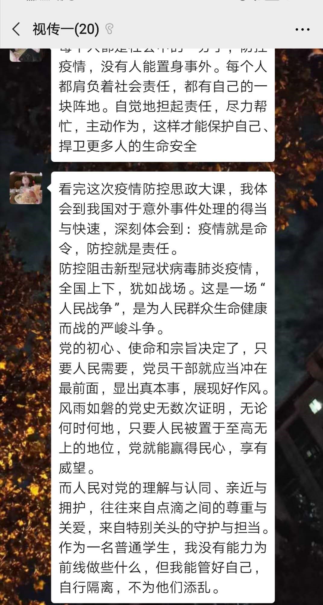 全班同学20人积极观看了今天的疫情防控思政大课,结束之后同学们在班级微信群进行了讨论,大家对自己身为一个中国人而感到荣幸。疫情当前,人人有责。我们对前线抗击疫情的广大一线医疗人员表示崇高的敬意,为抗击疫情过程中牺牲的无数仁人志士表达哀思,对有理想、有担当的青年们效法学习。疫情期间,我们要以大局为重,承担起一个大学生的责任。待在家里,听从国家安排不外出,不闲逛。在家关注疫情动态,给家人宣传知识,让他们不外出。这是考验中华民族的决胜时刻,我们要严格听从组织安排。同时,学习生活也不能懈怠,我们更应该严格要求自己,练就过硬本领,我也希望我以后能够成为一名新时代的造福人民的好同志,为社会的发展作出贡献!