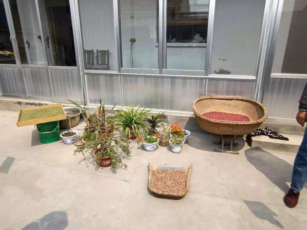 (村民在家种植的花草和晾晒的农作物)
