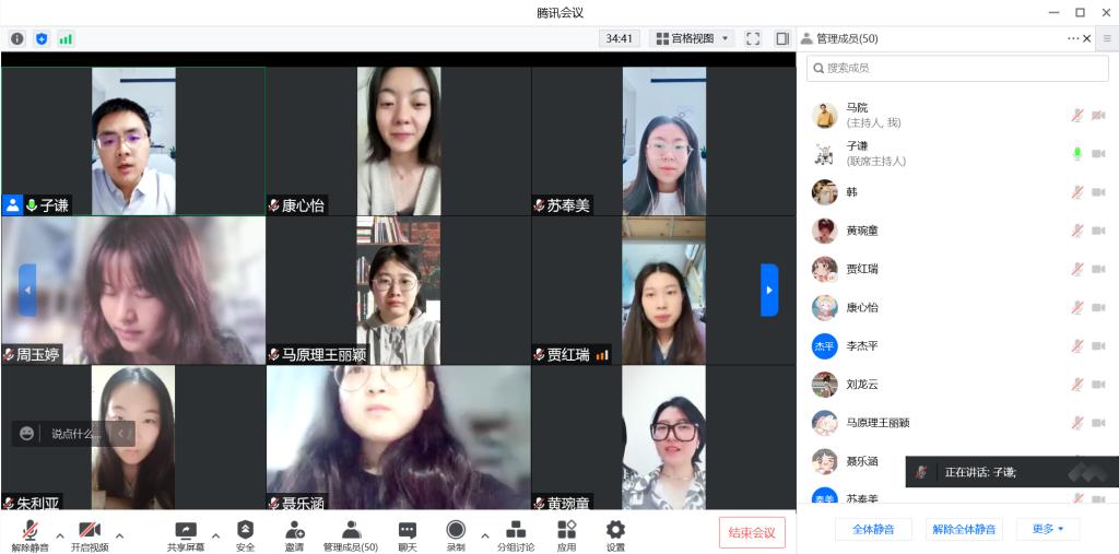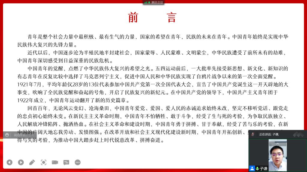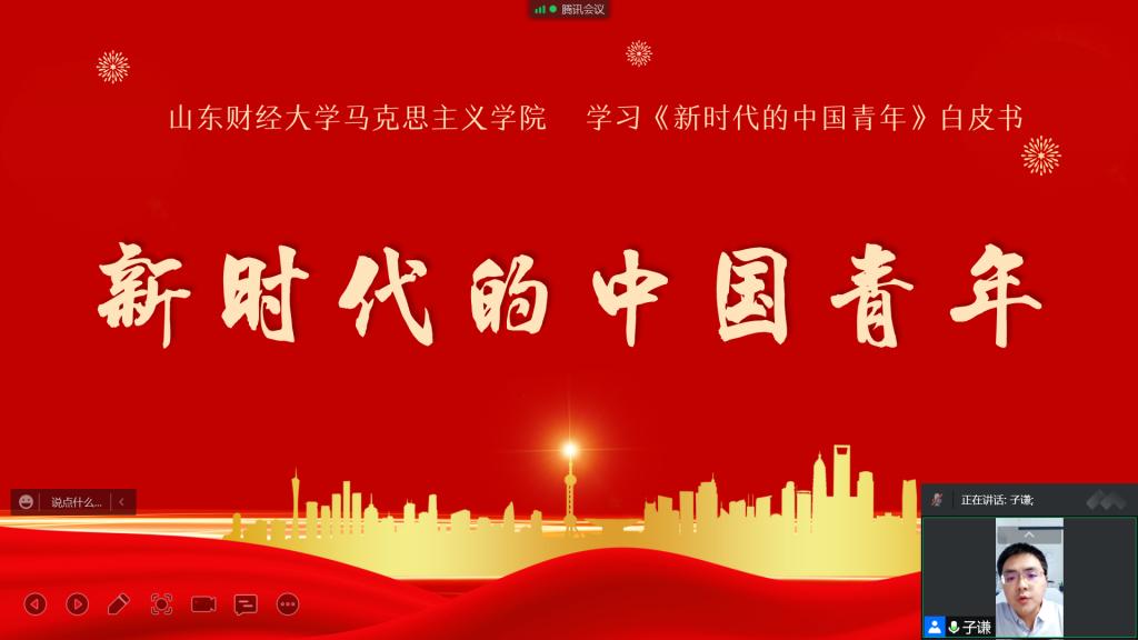 在线上研学中,学院范子谦老师首先带领同学们围绕“新时代中国青年生逢盛世、共享机遇;新时代中国青年素质过硬、全面发展;新时代中国青年勇挑重担、堪当大任;新时代中国青年胸怀世界、展现担当”这四个主题进行了深入学习。随后又分别从新时代青年成长环境、新时代青年发展成就、新时代青年担当作为、新时代青年人类情怀四个方面向同学们进行了详细的讲解。最后范子谦老师鼓励大家要做刚健自信、胸怀天下、担当有为,衷心拥护党的领导,奋力走在时代前列的新时代青年,并借白皮书原文结束语作尾:“青年一代有理想、有本领、有担当,国家就有前途,民族就有希望。中国的未来属于青年,世界的未来也属于青年。未来的中国青年,必将‘以青春之我,创建青春之家庭,青春之国家,青春之民族,青春之人类,青春之地球,青春之宇宙’,在实现民族复兴的伟大实践中放飞青春梦想。”