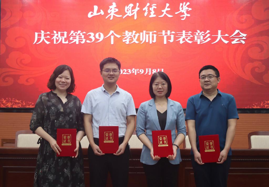 在表彰会上,我院多位教师获得表彰。徐莹入选山东省理论人才“百人工程”,�2022年度“山东学校思政课教师年度人物”表彰;王广获山东财经大�2023年度优秀教师表彰;郭小丽获山东财经大�2023年优秀工会工作者表彰;侯继迎获山东财经大学2023年研究生招生考试先进工作者�2023年度山东财经大学优秀科研成果奖一等奖表彰;范子谦获第二届全省学校思想政治理论课教学比赛一等奖以及山东财经大学2023年师德师风先进个人表彰;王真真获第二届全省学校思想政治理论课教学比赛一等奖表彰�
