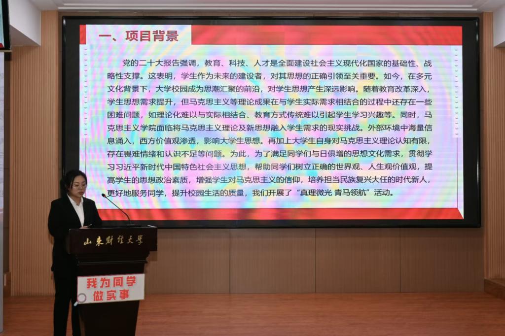 11月7日下午,山东财经大学首届学生会组织“我为同学做实事”项目交流展示活动暨秋季培训会在燕山校区举办。全校共17个研究生会项目参与,产生了研究生会精品项目2个,优秀项目3个。我院项目“真理微光 青马领航”荣获研究生会精品项目。
