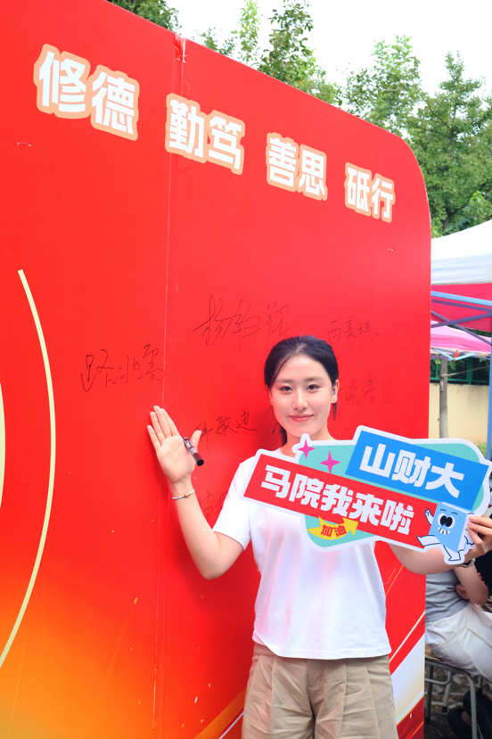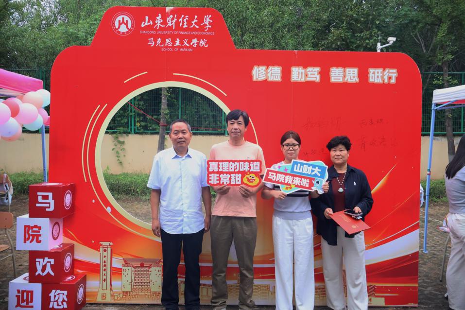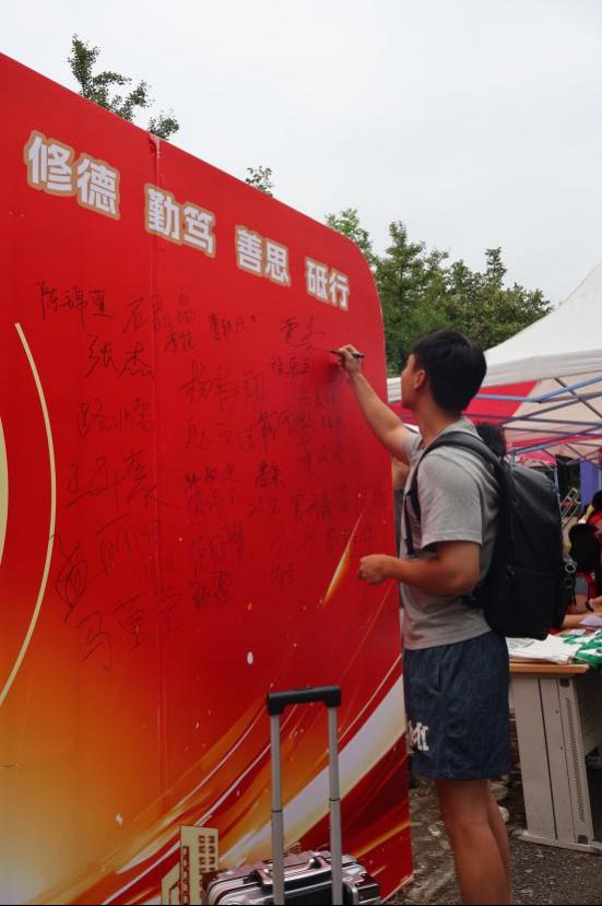 学院在报到点旁精心布置了主题拍照打卡墙,新生们执笔在墙上签下姓名,与父母并肩立于“马克思主义学院”立体字样前合影留念,鲜红的院徽印章与灿烂笑颜相映成趣,将“小家”与“大家”的温暖瞬间定格为青春纪念。
