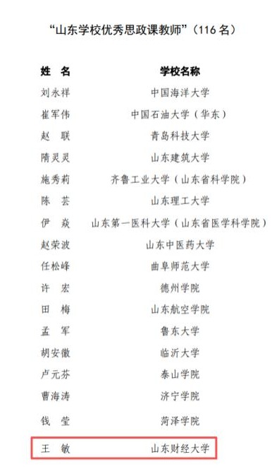 9月1日,省教育厅(省委教育工委)公布山东学校优秀思政课教师名单,马克思主义学院王敏教授获“山东学校优秀思政课教师”称号。