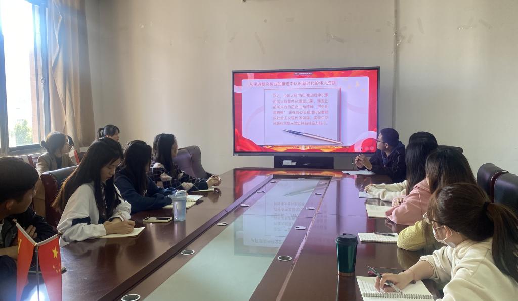 为庆祝中华人民共和国成立73周年,迎接党的二十大胜利召开,团结引领广大青年坚定跟党走,10月7日下午,马克思主义学院于图书馆606会议室开展了“喜迎二十大、永远跟党走、奋进新征程”主题教育实践活动中的“深刻认识新时代伟大成就”专题学习。此次活动由2021级团支书王鹏同学主持,马克思主义学院2021级团支部委员、2022级全体团员参加。