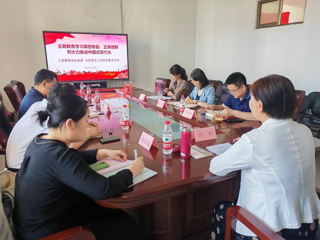 6月8日下午,马克思主义学院党委和工商管理学院党委联合组织召开学习贯彻习近平新时代中国特色社会主义思想主题教育读书班,以“正确理解和大力推进中国式现代化”为专题进行第四次集体学习,重点学习了习近平总书记在学习贯彻党的二十大精神研讨班开班式上的重要讲话和《中国式现代化是中国共产党领导的社会主义现代化》等篇章。会议由马克思主义学院党委书记石伟主持,马克思主义学院领导班子成员、工商管理学院领导班子成员和闫杰副教授参加。