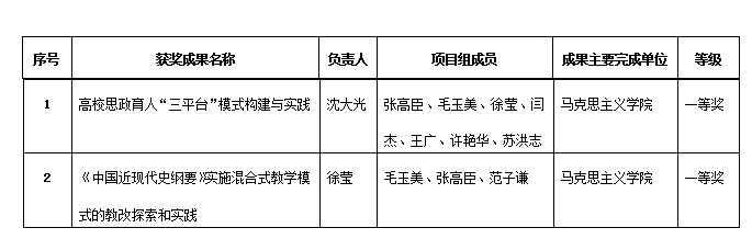 为及时总结先进教育教学经验,促进优秀教学成果在实际教学工作中的应用和转化,学校组织开展了2020年度校级教学成果奖评审工作。在各单位申报推荐的基础上,经专家评审,共确定特等奖6项,一等奖10项,二等奖20项。我院沈大光教授申报的《高校思政育人“三平台”模式构建与实践》、徐莹教授申报的《<中国近现代史纲要>实施混合式教学模式的教改探索和实践》都获得2020年度校级教学成果奖一等奖。这是我院首次在教学成果奖评选方面的突破,也是对马院教学改革成绩的肯定。