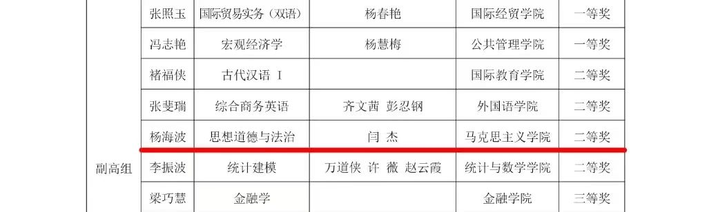山东财经大学2023年度教学创新大赛是山东财经大学根据山东省教育厅《关于举办2023年度山东省普通高等学校教师教学创新大赛的通知》(鲁教高函[2023]1号)要求举办的教学创新大赛,同时开展省赛选手推荐工作,旨在加强课程建设和新文科建设,落实立德树人根本任务,推动信息技术与高等教育教学融合创新发展。大赛根据主讲教师专业技术职务等级,分正高组、副高组、中级及以下组3个组别,另单设课程思政组别,共分4个组别。大赛共评选出一等奖9名、二等奖13名、三等奖18名。同时学校根据省教育厅分配的推荐名额,从校赛获奖教师中择优推荐参加省赛。省教育厅根据省赛成绩择优推荐参加全国比赛。其中,我院王广教授及其团队成员蔺淑英教授和王静老师,杨海波副教授及其团队成员闫杰副教授、王真真老师分别在正高组、副高组、中级及以下组名列前茅。